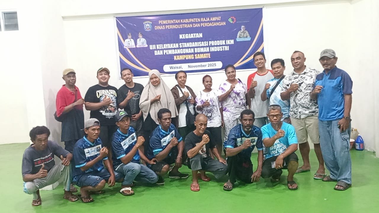 Samate, RajaAmpatNews— Pemerintah Kabupaten Raja Ampat melalui Dinas Perindustrian dan Perdagangan (Disperindag) melaksanakan kegiatan uji kelayakan dan standarisasi produk Industri Kecil dan Menengah (IKM) sekaligus pengembangan rumah industri tahun 2025. Kegiatan ini berlangsung selama empat hari, mulai 8 hingga 11 Desember 2025, bertempat di Rumah Produksi Minyak Kelapa Kampung Samate, Distrik Salawati Utara, Kabupaten Raja Ampat, Provinsi Papua Barat Daya.