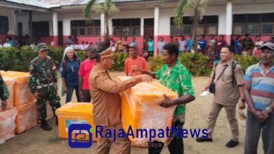 Selain meninjau pembangunan fisik pada kesempatan tersebut juga diserahkan bantuan bantuan ke ibu-ibu dan penyerahan bantuan 50 cool box bagi nelayan kampung Saporkren.